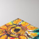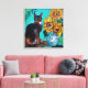 Chat noir expressif, capricieux, tournesols colorés et feuilles verts dans les couleurs jaune et bleu turquoise. Peinture acrylique originale artistique et vibrante sur panneau en bois par Bulgan Lumini (c)