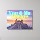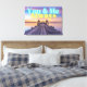 Impression de toile romantique et moderne avec photo de quai de bateau tropical île au coucher du soleil avec aqua néon et texte or qui dit "You and Me Always"