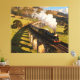 This digital artwork features a dynamic scene of a classic steam locomotive pulling train carriages across a viaduct in the English countryside. created by digital artist Jayne Wilson.