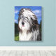 Stella est un beau chien de mouton anglais gris et blanc avec un regard plein d'âme et ses cheveux longs et soyeux soufflant dans le vent, peint par Traci Van Wagoner.