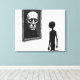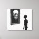 A stick figure man stands in front of a portrait, gazing at a sad-looking bald man in an art gallery