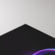 Glowing, purple infinity symbole with flying, luminous, blue hummingbird on black background. Néon.