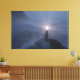 Un phare avec une croix tandis que la lumière rayonne sur les rochers et les briseurs d'un rivage couvert de brouillard, montrant les bateaux entrants le chemin de la sécurité.