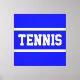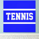 This sporty design features athletic TENNIS text inside white racing stripes against bright blue background. The text and colors can be personalized.