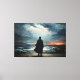 Before a restless sea and a dramatic sky, a solitary figure gazes at the unknown. The twilight glow suggests hope, while the boat on the shore invites a journey.
