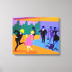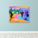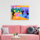 Cette Imprimante en toile étanche rétro urbaine sur le toit est enivrante dans ses détails. Le dessin animé présente le type de cocktail extrêmement sophistiqué que l'on ne voit normalement que dans les films des années 1960. Les fêtards ont beaucoup à faire. Du confort d'un appartement penthouse, les clients profitent de la vue et de l'ambiance. L'éclairage donne de l'humeur et on peut voir les silhouettes sombres d'un beau couple dansant le cha-cha. Au sol, il y a un violet, portable, joueur de disque aux pieds du couple de danse. Plusieurs albums ont été éparpillés à proximité. Même avec la lumière tamisée qui fait apparaître pratiquement tout dans la pièce dans les tons violet, bleu et noir, on peut dire que tout le monde est habillé aux neuf. Derrière la danse, un couple intérieur, il y a un gentleman en costume noir tenant un martini verre. Il parle à une beauté brune qui se tient près d'un des murs en verre du sol au plafond. À partir d'un lampadaire, une seule ampoule jette une lueur romantique sur la scène. Il ne manque que l'abat-jour. Hmm... Où est l'ombre ? C'est sur la tête d'un homme qui a fait la fête sur le toit orange. Il a clairement de beaux mouvements de danse et il n'a pas peur de les montrer au monde ! Son compagnon est une femme blonde et pleine de forme, vêtue d'une robe rose vif. Son dos est arqué alors qu'elle jette son martini d'une manière non inhibée. Au-delà de la fête, on découvre un horizon turquoise à couper le souffle, avec des gratte-ciel et un ciel violet. Si c'est ainsi que vit l'autre moitié, inscrivez-moi !