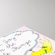 Trouvez la joie dans les choses simples. Un dicton positif / citer l'inspiration écrite sur un nuage avec un petit croquis de fille dessinant sur une balançoire entourée d'oiseaux mignons, d'une maison d'oiseaux, de papillons, de fleurs et d'une abeille. En rose, blues et jaunes.
