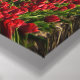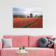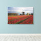 Impression paysage de toile d'un paysage printanier avec un champ avec tulipes rouges et d'autres fleurs et un moulin à vent au lever du soleil dans les jardins de Keukenhof, région Bulb, la Pays-Bas. Grande décoration colorée sur votre mur !