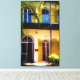 Le soleil de Floride illumine l'entrée de cette grande vieille maison à Key West, réchauffant la façade couleur crème avec ses volets couleur moutarde. La maison était autrefois la maison de l'auteur Ernest Hemingway, et est maintenant un musée. Sur la photo d'origine de cette Impression de toile, des frondes de palmiers de grande taille surplombent le balcon du deuxième étage avec ses fenêtres voûtées reflétant le ciel bleu tropical. Aucun des célèbres chats n'est en vue.
