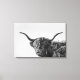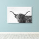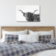 Impression en toile d'une vache écossaise Higland robuste mais drôle avec de grandes cornes, de longs poils devant les yeux et la bouche mi ouverte en noir et blanc / monochrome. Superbe décoration sur votre mur !