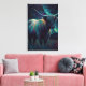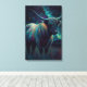 Impression sur toile colorée de vache Highland bleue abstraite dans un pâturage la nuit. Belle vache moderne dans un pâturage rural la nuit entourée d'étoiles.