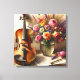 Aquarelle de l'art de l'air représentant un violon penché contre le mur, des partitions et un vase de fleurs en verre.