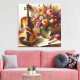Aquarelle de l'art de l'air représentant un violon penché contre le mur, des partitions et un vase de fleurs en verre.
