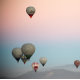 Vol en montgolfière tôt le matin au-dessus de montagnes enneigées, Cappadoce, Turquie.