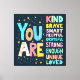 Ce design typographique dynamique et stimulant éclate de couleur et de positivité, ce qui en fait un rappel parfait de l'estime de soi et de la confiance. Avec des lettres audacieuses et artistiques dans un mélange ludique de motifs et de textures, les mots "Vous êtes" prennent vie en même temps que des affirmations habilitantes comme "Le genre", "Courageux", "Fort" et "Aimé". Les gribouillis, les étoiles éparpillées et les fleuris charmants ajoutent une esthétique boho moderne et amusante, mêlant éléments d'art populaire et typographie contemporaine. L'arrière - plan bleu foncé améliore les couleurs vives, créant un contraste frappant qui fait ressortir le message. Idéal pour ceux qui apprécient la typographie artistique avec une touche de créativité, ce design rayonne d'encouragement et de chaleur, embrassant un style visuel joyeux et expressif. Que vous soyez attirés par l'énergie joyeuse du maximalisme ou par le charme réconfortant de l'esthétique indie, cette pièce parle au coeur avec son esprit de célébration et de motivation. L'IA a généré des oeuvres d'art.
