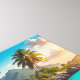Un paradis tropical avec vue sur l'océan, des palmiers et des fleurs mauves autour, petite plage. Style de peinture acrylique.