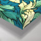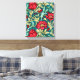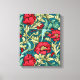 An stylish floral pattern of red flowers and leaves on a blue background, inspired by the famous English Arts and Crafts designer William Morris.