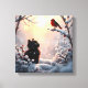 Un paysage hivernal serein avec un petit chaton noir et un rouge vif rouge sur fond de feuillage glacé et de flocons de neige en chute douce, évoquant un sentiment de magie et d'émerveillement dans un style cinématographique et épique qui rappelle les peintures mattes classiques et l'art numérique atmosphérique.