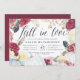 D'élégantes invitations rustiques pour les douches nuptiales d'automne ou d'automne sont entourées de fleurs d'aquarelle bordeaux, de plumes de saumons et de citrouilles blancs. "Fall in love" apparaît en haut dans le script de calligraphie chic en lettres. Personnalisez avec votre douche nuptiale et les détails du registre sous le riche lettrage bleu marine.