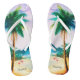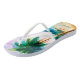 Beach Blue Green Flip Flops avec Watercolor Beach, Sand, palmier tropical design et flamants roses. Utilisez cette option de modèle personnalisée pour modifier le texte des deux côtés. | Utilisez l'option personnaliser pour modifier le style, la taille et la couleur du texte si nécessaire.