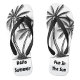 Une paire de tongs avec des motifs de palmiers sur une plage de sable, le texte "Bonjour été" et "Fun in The Sun" dans l'arrière - plan.