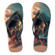 Un grand crâne est posé sur le sable dans l'océan, dans le style de paysages 3D surréalistes, palette de couleurs intenses, redshift, illustrations vibrantes, paysages photoréalistes, explorations texturales