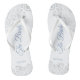 Dansez la nuit avec ces belles tongs mariages. Conçues pour la mariée, elles présentent un design simple mais élégant avec des écritures bleues poussiéreuses sur un arrière - plan blanc et des boucles et des tourbillons gris argent fantaisie. Belle façon de rester chic et approprié tout en donnant à vos pieds une pause après une longue journée.
