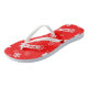Une paire de tongs avec une répétition transparente blanche d'éléments de Noël - bas, gingerbreadman, flocons de neige, rennes, ornements de Noël, bougies, arbre de Noël, et les mots "Joyeux Noël" - en illustration, contre un arrière - plan rouge.