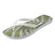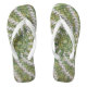 Armoiries en spirale blanche avec centre vert et arrière - plan, est une image photographique d'un motif circulaire travaillé au crochet. L'image est centrée sur chaque sandale.