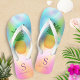 Créez des sandales tropicales uniques pour les vacances d'été ou la fête de la piscine de plage personnalisées avec vos initiales et nom qui présentent un design holographique style néon avec ananas. Le modèle facilite la personnaliser.