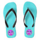 Cette paire de tongs est d'une couleur bleu aqua brillante avec une mignonne lune violette avec un visage qui a des joues étoilées et des lèvres roses entourées d'étoiles jaunes.