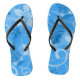 Une paire de tongs bleus avec une ambiance tropicale et de vacances hawaïennes. Elles sont équipées d'un exotique motif hawaïen de masques Tiki, d'hibiscus, de pétales de lotus et de feuilles pour ajouter une touche chic et colorée à vos chaussures d'été pour la plage cette saison.