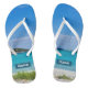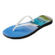 Ces tongs présentent une photo originale d'une plage de sable blanc paradisiaque à Corse (France), avec sa belle mer aux eaux claires dans toutes les nuances de bleu, sous un ciel bleu par jour ensoleillé, avec un îlot et un voilier au loin.
