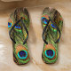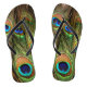 Une paire de plumes Peacock Flip Flops avec une photo de quelques belles plumes de paon détaillées. Marchez avec style. Vous pouvez le customiser en changeant la largeur de la sangle et la couleur, sur la droite. Bonne personnalisation !