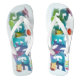 Une paire de tongs blancs avec un dessin animé coloré sur les semelles. Le design semble être une pile de lettres stylisées avec le mot Science dans les tons vert, bleu et violet, avec des éléments supplémentaires comme une casquette de graduation, des beakers et des livres incorporés dans le design. Les courroies des tongs sont blanches et sont faites d'un matériau texturé. L'arrière - plan est de blanc clair, mettant l'accent sur le design des tongs.