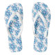 Des tongs adultes parfaits pour tous vos loisirs estivaux, montrés ici en blanc avec un imprimé coloré de fleurs bleues et violettes avec de larges sangles blanches et un lit de pied blanc. Customisez cet objet ou achetez tel quel.