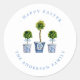 Étiquette/sceau personnalisée Joyeuses Pâques élégante et chic avec topiaires aquarelle dans un pot bleu et blanc.