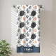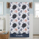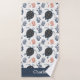 Ce design de serviette de bain est complet avec un motif transparent de tortues de mer et de corail bleu et rouge sur un fond blanc. Il y a un espace pour ajouter votre nom en bas de la serviette.