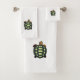 Tortue verte sur serviette blanche. Ensemble de serviettes pour une décoration intérieure élégante.