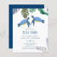 Cette pièce de mariage moderne décorée sur le thème de la mer et décorée de tortues de mer et de feuilles tropicaux fait partie d'une collection plus grande. Le thème des couleurs est bleu et jaune vif.