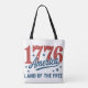 Celebrate this extra special milestone Independence day with an anniversary tote! This tote features the year 1776 in bold red letters with navy blue lettering that says "America land of the free." Perfect for celebrating the 250th anniversary of America.