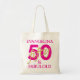 Personalized Bold 50 and Fabulous 50th Birthday Budget Tote Bag with gold and pink typography. Ideal for glam birthday celebrations as a matching group tote in honor of the Birthday Girl. Add your name. Can also be used as a gift bag or favor bag for your guests.