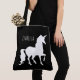 Sac fourre-tout personnalisé à la mode moderne à amusement de silhouette noire et blanche de licorne. Choisissez de deux tailles et longueurs différentes de courroie. Personnalisez ces amusement et licorne colorée dans la police blanche sur votre choix de couleur d'arrière - plan. Noircissez l'arrière - plan avec la licorne blanche lumineuse au centre. CUSTOMISEZ pour changer en rose, le pourpre ou toute autre couleur sur l'avant et le dos. Cadeau d'amusement pour des enfants, tweens, et ados qui aiment des licornes et des créatures magiques. Coloré, moderne et élégant.