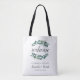 Bienvenue dans votre mariage avec ces totes botaniques chic "bienvenue" en calligraphie, entourées de verdure botanique luxuriante et de feuilles eucalyptus. "...à notre heureux toujours après" apparaît en dessous avec vos noms et date mariage.