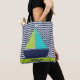 Tout sur un sac fourre-tout à motifs avec un arrière - plan de rayures de chevrons bleu marine et blanc avec voilier bleu marine avec voilier bleu et vert polka pointillés voiles. Il y a une bande verte où vous pouvez facilement personnaliser avec un nom.