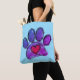 Peinture d'aquarelle numérique empreinte de patte et coeur de chien. Sacs fourre-tout personnalisés avec tout le surimpression. Idée cadeau pour les amoureux de les chiens.