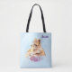Un sac fourre-tout avec un joli tableau aquarelle d'un lion-mère tenant son bébé. Un joli bouquet fleuri violet en dessous ajoute une touche douce à cette image douce et adorable. Arrière - plan bleu clair. Personnalisez avec un nom.