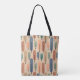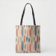 Ce sac fourre-tout a un design moderne du milieu du siècle de longs ovales en pêche, vert, bleu, turquoise et brun clair avec des lignes noires avec des cercles sur les extrémités.