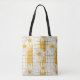 Sac fourre-tout fleuri joyeux avec marguerites blanches et croustillantes aux centres jaunes ensoleillés, encadré d'une grille crème légère et de rayures verticales jaunes. Le style épuré, dessiné à la main et la palette de couleurs fraîches évoquent une esthétique brillante, stimulante et intemporelle, parfaite pour les motifs du printemps, de l'été et de la nature.