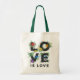 Le sac fourre-tout de fierté avec amour est amour écrit en lettres noires audacieuses décorées de verdure, de baies et de fleurs en rouge, orange, jaune, vert, bleu et violet, inspirées des couleurs du drapeau de la fierté arc-en-ciel.
